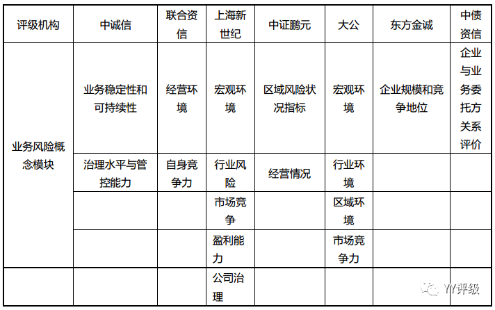上海新世紀和大公國際還強調(diào)了行業(yè)風險:上海新世紀對于行業(yè)風險要素主要考察行業(yè)的經(jīng)營環(huán)境與競爭態(tài)勢、增長及盈利趨勢、成本變化和風險事件、融資環(huán)境變化與趨勢、政府管制與法律風險等因素,新世紀評級對行業(yè)要素進行綜合評估和分析,定期賦予行業(yè)風險分檔。大公國際則從政策環(huán)境和監(jiān)管框架兩個方面進行分析。