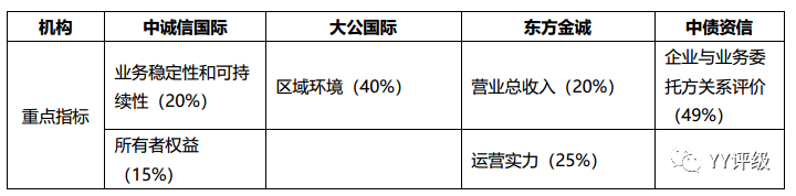 考察采用打分匯總法的評級機構(gòu)的評級方法可以發(fā)現(xiàn),上海新世紀的指標權(quán)重設置比較平均,沒有特別突出的關鍵性指標;大公國際設置的指標中區(qū)域環(huán)境相對較為重要;中誠信較為重視業(yè)務穩(wěn)定性和可持續(xù)性以及所有者權(quán)益這兩個指標;中債資信認為企業(yè)與業(yè)務委托方關系評價較為重要;東方金誠認為營業(yè)總收入和運營實力較為重要。