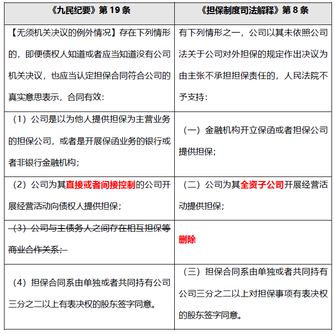 《九民紀(jì)要》第19條規(guī)定了四種“無須機(jī)關(guān)決議的例外情況”,但《擔(dān)保制度司法解釋》第7條對這些例外情況進(jìn)行了極大的縮減,具體對比如下:
