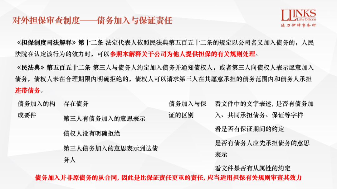 關(guān)于債務(wù)加入,《擔(dān)保制度司法解釋》第12條進(jìn)行了明確的規(guī)定,人民法院在認(rèn)定債務(wù)加入效力時(shí),可以參考該司法解釋為他人提供的有關(guān)規(guī)則處理,即相對人負(fù)有審查債務(wù)加入的適格決議的義務(wù)。在該等規(guī)定背后,最高法的邏輯在于債務(wù)加入較對外擔(dān)保需要承擔(dān)更重的責(zé)任,承擔(dān)擔(dān)保責(zé)任后擔(dān)保人享有向債務(wù)人追償?shù)臋?quán)利, 但債務(wù)加入的第三人承擔(dān)債務(wù)后并不享有該等追償權(quán), 那么根據(jù)舉輕以明重的原則, 既然提供擔(dān)保需要適格決議, 債務(wù)加入就“更需要”適格決議了。