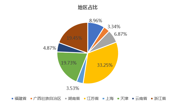 通過下圖可以發(fā)現(xiàn),2019年保障性住房ABS較過往幾年出現(xiàn)了非常大的增長(zhǎng),截至2019年11月末,發(fā)行金額已經(jīng)超過過去兩年之和。在地區(qū)分布方面,江蘇、浙江和天津位列前三,三個(gè)地區(qū)占比已經(jīng)超過70%。