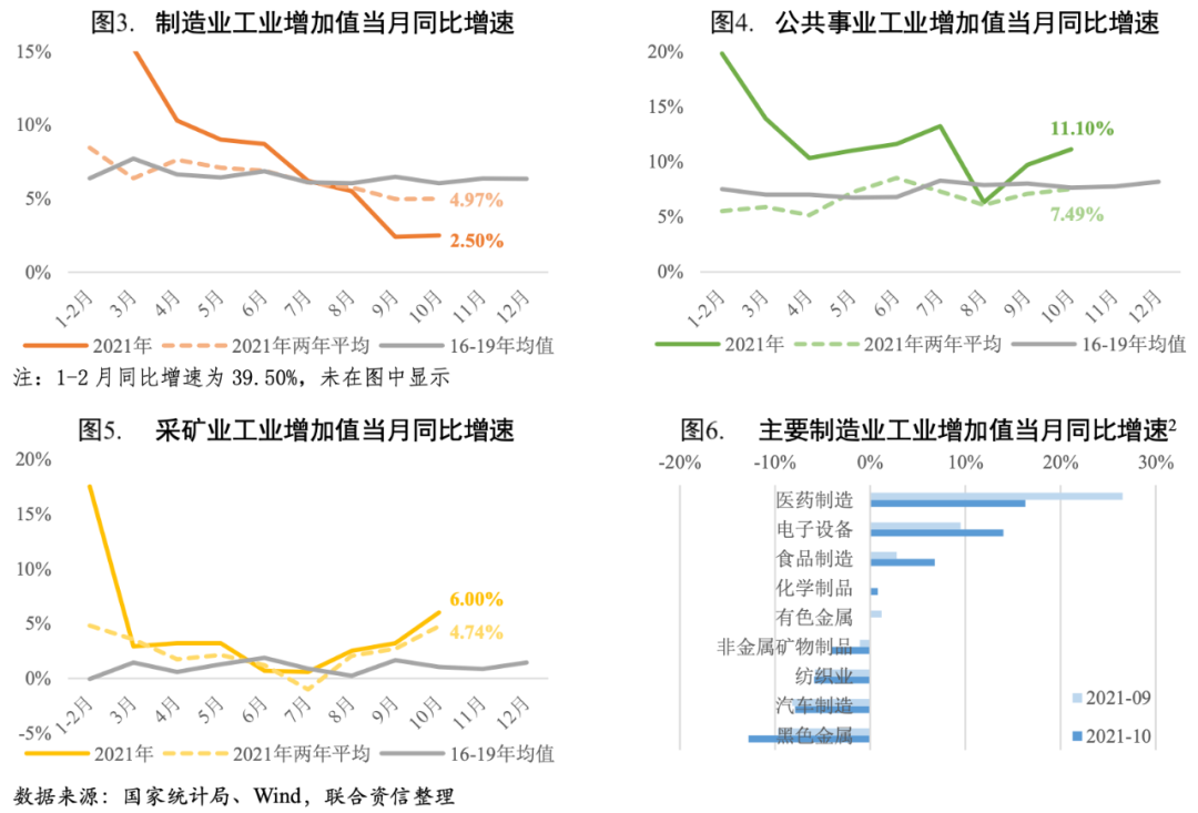 三大門類工業(yè)增加值同比增速均有所加快。2021年10月制造業(yè)工業(yè)增加值同比增長(zhǎng)2.50%,增速穩(wěn)中有升,兩年平均增速為4.97%,與上月持平,略低于2016-2019年同期均值水平;得益于能源保供政策發(fā)力、優(yōu)質(zhì)煤炭產(chǎn)能加速釋放,采礦業(yè)、電力、熱力、燃?xì)饧八a(chǎn)和供應(yīng)業(yè)(以下簡(jiǎn)稱“公用事業(yè)”)工業(yè)增加值同比增速和兩年平均增速均有明顯提升。