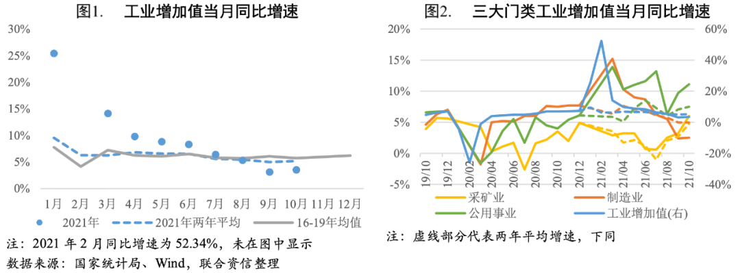 工業(yè)生產(chǎn)小幅回升。2021年10月,我國(guó)規(guī)模以上工業(yè)增加值同比增長(zhǎng)3.50%,兩年平均增長(zhǎng)5.19%,增速較上月分別加快0.40、0.21個(gè)百分點(diǎn),分別為3月和5月以來的首次回升;環(huán)比增長(zhǎng)0.39%,增速較上月亦有所提高。工業(yè)生產(chǎn)出現(xiàn)積極變化,主要是受到能源保供政策發(fā)力拉動(dòng)。10月供給端限電限產(chǎn)的約束有所改善,但年底前能耗雙控達(dá)標(biāo)壓力仍然較大,疊加冬季可能形成拉尼娜現(xiàn)象(出現(xiàn)異常降溫的極寒天氣)、原材料價(jià)格高位上漲等因素,工業(yè)生產(chǎn)依然面臨壓力。