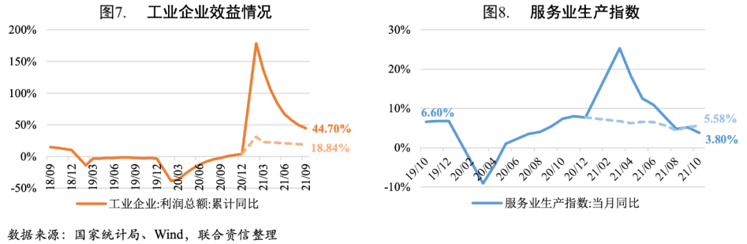 2021年10月,我國(guó)多項(xiàng)經(jīng)濟(jì)指標(biāo)出現(xiàn)改善跡象。生產(chǎn)端,10月工業(yè)增加值同比增速和兩年平均增速[1]結(jié)束下行趨勢(shì),企穩(wěn)反彈,主要是受到能源保供政策發(fā)力拉動(dòng)。需求端,固定資產(chǎn)投資增速繼續(xù)放緩,主要是受房地產(chǎn)和基建投資增速放緩?fù)侠郏圃鞓I(yè)投資在出口帶動(dòng)下維持高增長(zhǎng);消費(fèi)在假日和價(jià)格雙重因素的影響下,延續(xù)小幅改善趨勢(shì),預(yù)計(jì)11月電商促銷活動(dòng)疊加失業(yè)率下降帶來的居民可支配收入的增加將繼續(xù)提振消費(fèi),但十月下旬以來多地疫情散發(fā)將拖累消費(fèi)修復(fù);出口在外需、出口替代以及價(jià)格的支撐下,保持較強(qiáng)的韌性,年內(nèi)出口增速有望保持在較高的水平。整體看,雖然10月多項(xiàng)經(jīng)濟(jì)指標(biāo)均出現(xiàn)改善的信號(hào),但疫情對(duì)消費(fèi)產(chǎn)生擾動(dòng),房地產(chǎn)投資仍將維持下行趨勢(shì),環(huán)保和高能耗行業(yè)限產(chǎn)以及冬季極端氣候現(xiàn)象或?qū)?duì)工業(yè)生產(chǎn)產(chǎn)生拖累,年內(nèi)經(jīng)濟(jì)仍存在下行壓力。