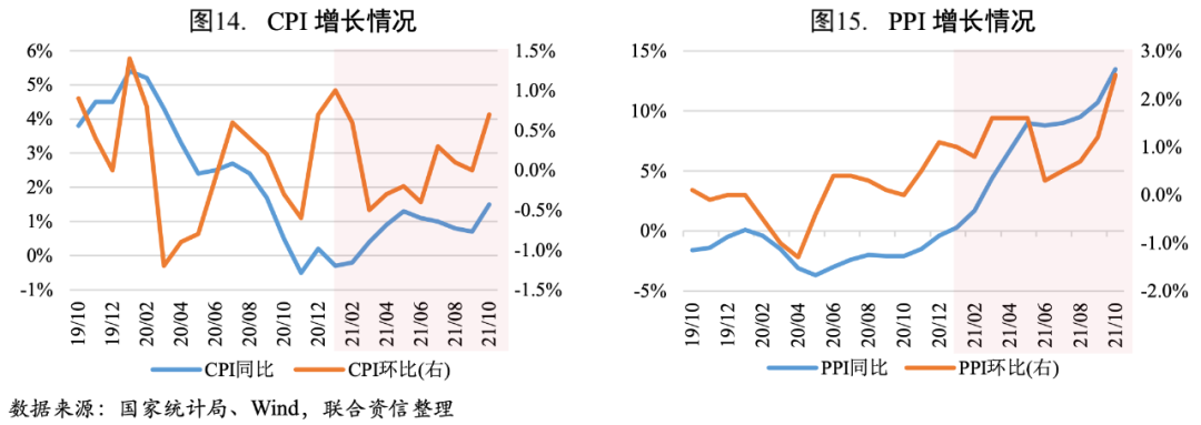 受國(guó)際輸入性因素疊加國(guó)內(nèi)主要能源和原材料供應(yīng)偏緊影響,10月PPI漲幅再次擴(kuò)大。10月PPI同比增幅較9月擴(kuò)大2.80個(gè)百分點(diǎn)至13.50%,創(chuàng)歷史最高值。其中,生產(chǎn)資料價(jià)格上漲17.90%,漲幅擴(kuò)大3.70個(gè)百分點(diǎn),主要是受國(guó)際價(jià)格上漲疊加國(guó)內(nèi)主要能源和原材料供應(yīng)偏緊影響;生活資料價(jià)格上漲0.60%,漲幅擴(kuò)大0.20個(gè)百分點(diǎn)。從環(huán)比看,PPI漲幅較9月擴(kuò)大1.30個(gè)百分點(diǎn)至2.50%。近期煤炭、鋼材等價(jià)格下行,疊加國(guó)內(nèi)大宗商品價(jià)格控制政策、北方建筑工業(yè)停工導(dǎo)致黑色金屬需求減弱,或?qū)?dòng)11月PPI下行,PPI-CPI剪刀差收窄,中下游企業(yè)盈利情況或?qū)⒑棉D(zhuǎn)。