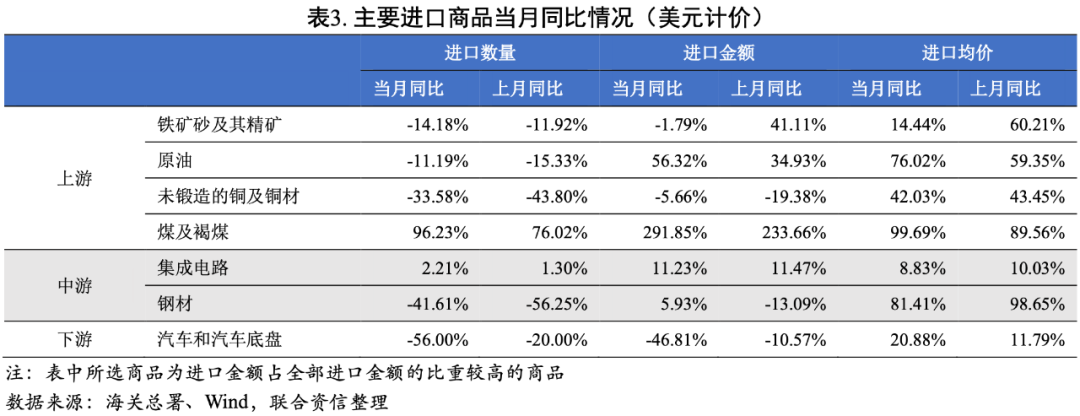 進(jìn)口方面,從主要進(jìn)口商品來看,煤炭因?yàn)槎竟┡枨罅枯^大,進(jìn)口數(shù)量大幅上升;集成電路由于全球供應(yīng)鏈短缺導(dǎo)致進(jìn)口數(shù)量增速維持低位;價(jià)格上漲疊加國(guó)內(nèi)需求減弱導(dǎo)致鐵礦砂、原油、銅、鋼材以及汽車的進(jìn)口數(shù)量均同比減少。年內(nèi)能耗雙控壓力仍然較大,國(guó)內(nèi)工業(yè)生產(chǎn)承壓,導(dǎo)致對(duì)海外原料的需求下降,同時(shí)疊加疫情反復(fù)對(duì)消費(fèi)的制約,預(yù)計(jì)進(jìn)口數(shù)量或?qū)⒗^續(xù)下降。