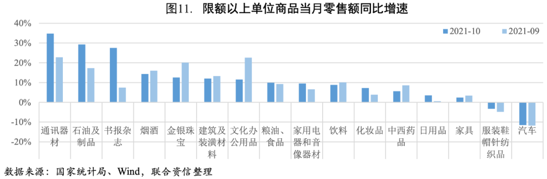 商品零售小幅增加,餐飲收入增速小幅回落。10月商品零售同比增速較上月上升0.7個(gè)百分點(diǎn)至5.20%,增速仍低于疫情前水平。汽車消費(fèi)繼續(xù)負(fù)增長(zhǎng),是拖累商品零售的一大因素;通訊器材、石油及制品和書報(bào)雜志增速均在25%以上,且較上月顯著增長(zhǎng);服裝鞋帽針紡織品零售額增速降幅雖有收窄但依然為負(fù)。餐飲收入增速小幅回落,餐飲收入增速較9月下降1.1個(gè)百分點(diǎn)至2.00%,預(yù)計(jì)11月受疫情影響,餐飲收入增速會(huì)有所下降。