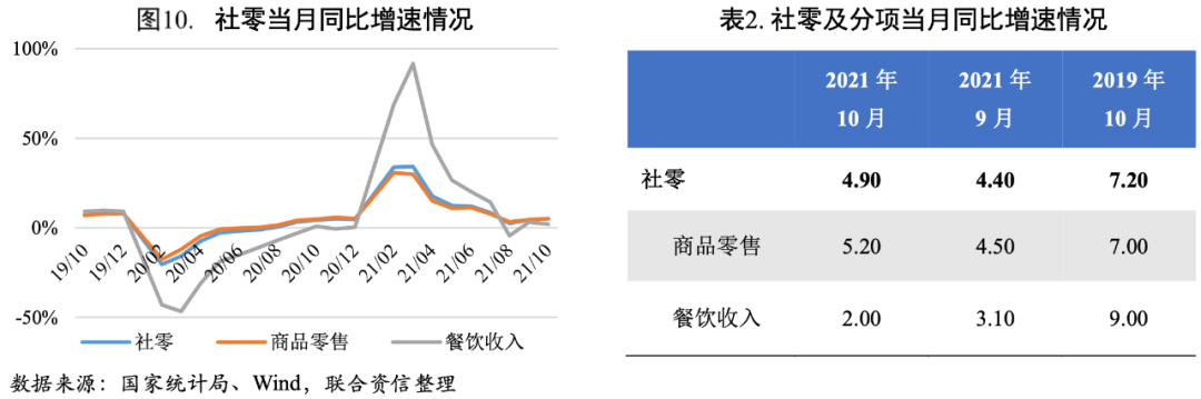 國(guó)慶假期效應(yīng)提振消費(fèi),但疫情和天氣因素制約修復(fù)進(jìn)程。2021年10月社會(huì)消費(fèi)品零售總額(下稱“社零”)增長(zhǎng)4.90%,連續(xù)第二個(gè)月回升;環(huán)比增長(zhǎng)0.43%,較上月小幅提升。社零同比和環(huán)比增速小幅回升主要是受益于國(guó)慶假期消費(fèi)帶動(dòng),同時(shí)價(jià)格因素也是推升社零增速的原因之一。但天氣以及疫情制約社零的修復(fù),社零同比和環(huán)比增速較疫情前水平尚有修復(fù)空間。預(yù)計(jì)11月電商促銷活動(dòng)疊加失業(yè)率下降帶來的居民可支配收入的增加將繼續(xù)提振消費(fèi),但十月下旬以來多地疫情散發(fā)將拖累消費(fèi)修復(fù)。