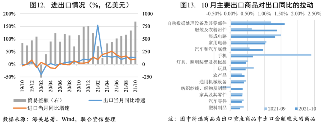 2021年10月我國(guó)貨物進(jìn)出口總額5159.03億美元,同比增長(zhǎng)24.30%,增速仍然較高;但環(huán)比(-5.30%)有所下降。其中,出口3002.21億美元,同比增長(zhǎng)27.10%,仍然維持較高增速,環(huán)比小幅下降1.80%,依然表現(xiàn)出較強(qiáng)的韌性,一方面是由于歐美作為主要需求國(guó),產(chǎn)需缺口依然較大,另一方面出口替代效應(yīng)導(dǎo)致我國(guó)出口增加。進(jìn)口2156.80億美元,同比增長(zhǎng)20.60%,主要是價(jià)格上漲和去年基數(shù)(較低)因素導(dǎo)致;環(huán)比下降9.70%,符合往年下行規(guī)律。整體看,內(nèi)需對(duì)進(jìn)口的支撐作用較弱。貿(mào)易順差845.40億美元,創(chuàng)歷史最高值。2021年前10個(gè)月貿(mào)易順差累計(jì)5106.35億美元,已接近去年全年水平,今年順差規(guī)模或?qū)?chuàng)歷史最高,對(duì)經(jīng)濟(jì)的拉動(dòng)作用或?qū)⒂兴嵘?/p>