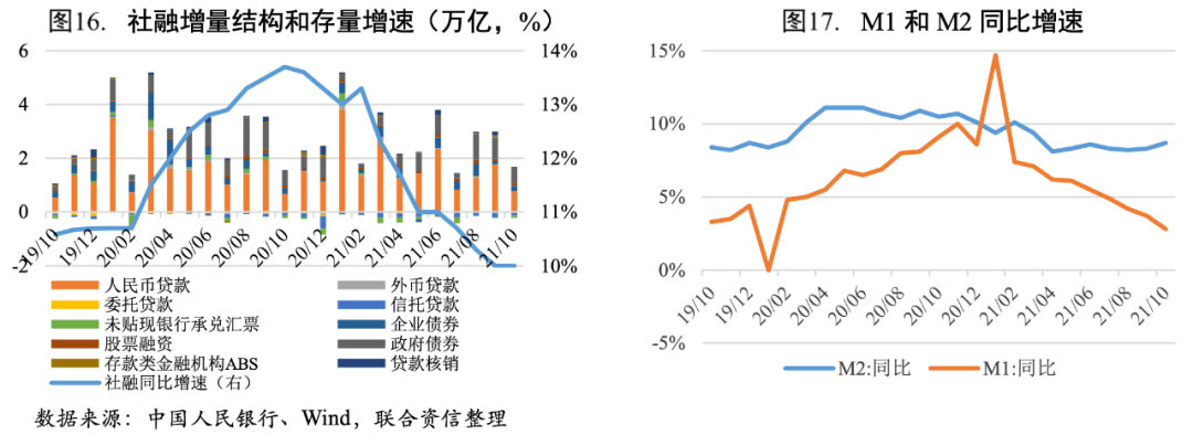 社融存量同比增速與上月持平,人民幣貸款和政府債券融資是主要支撐。2021年10月新增社融1.59萬億元,同比多增1971億元,三個(gè)月以來首次轉(zhuǎn)正;社融存量增速為10%,與9月持平。從社融結(jié)構(gòu)來看,10月新增人民幣貸款和政府債券融資同比分別多增1089億元、1236億元,是社融的主要支撐項(xiàng);新增委托、信托貸款和未貼現(xiàn)銀行承兌匯票共-2120億元,非標(biāo)融資規(guī)模持續(xù)萎縮;其他分項(xiàng)同比變化不大。在政府債發(fā)行與上年錯(cuò)期的影響下,疊加房企融資政策邊際松動(dòng),以及9月底央行宣布年內(nèi)新增的3000億小微再貸款額度逐步落地,對(duì)企業(yè)貸款也會(huì)形成一定支撐,預(yù)計(jì)11、12月社融增速將會(huì)有所回升。