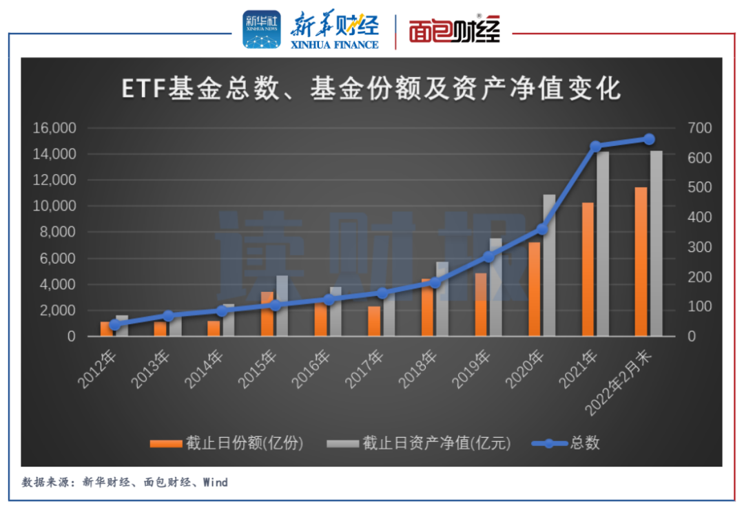 圖1:2012年至2022年2月末ETF基金總數(shù)、基金份額及資產(chǎn)凈值變化