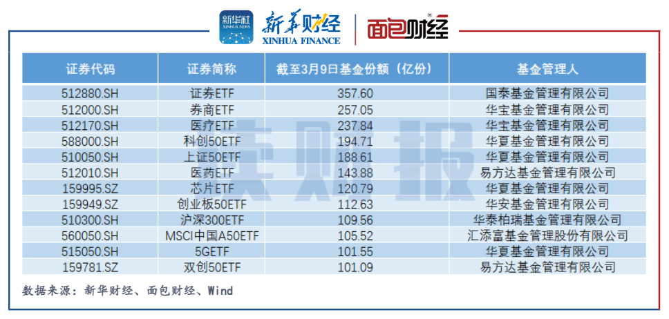 根據(jù)所屬類型劃分,股票型ETF的規(guī)模占據(jù)絕對主導地位,最新的資產(chǎn)凈值超過9000億元、基金份額超過6500億份。其中,共有12只基金截至今年3月9日的基金份額超過100億份,證券ETF、券商ETF、醫(yī)療ETF位居前三,基金份額分別為357.60億份、257.05億份以及237.84億份。