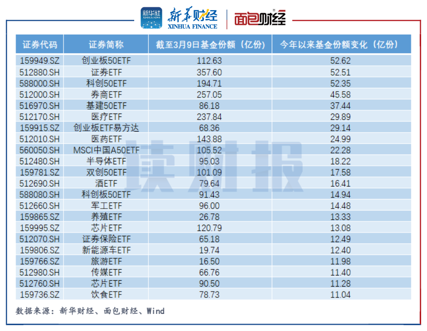今年以來創(chuàng)業(yè)板50ETF、證券ETF等份額顯著增長 上證50ETF下降最多