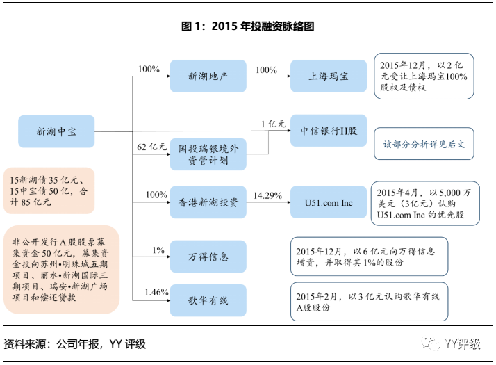 2015年,公司融資端有息債務(wù)增加70億元,包括當(dāng)年新發(fā)行的15新湖債和15中寶債合計85億元;另外非公開發(fā)行股票50億元。帶來的資產(chǎn)端變化包括:(1)其他應(yīng)收款增加17億元,新增的部分主要是與香港新湖9億元和與上海瑪寶7.2億元的往來款;(2)可供出售金融資產(chǎn)增加57億元,資金投向包括境外資管計劃62億元、萬得信息6億元、51信用卡3億元、歌華有線3億元和中信銀行1億元;(3)長期應(yīng)收款增加24億元,具體未披露明細(xì),但根據(jù)合并報表中長期應(yīng)收款余額為0可推測該筆為集團(tuán)內(nèi)部往來款;(4)長期股權(quán)投資增加7億元,主要為權(quán)益法核算下的正常變動,但其子公司新湖地產(chǎn)在2015年12月以2億元收購了上海瑪寶。綜合來看,2015年新湖中寶債券融資85億元,新增金融投資75億元,考慮付息情況等變化,幾乎所有的債券融資都投向了投資板塊。