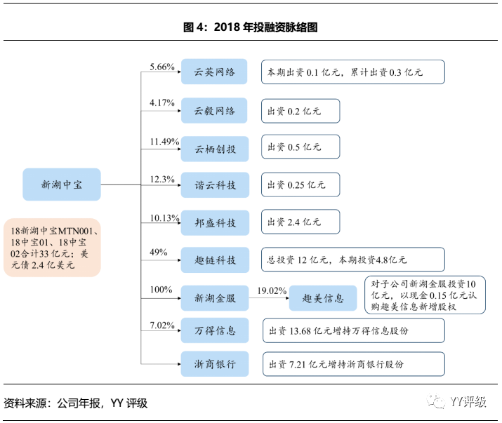2019年,公司融資端有息債務(wù)減少59億元,償還到期債務(wù)15中寶債50億元,另新發(fā)行19新湖01、19新湖03合計16.7億元。此外,公司當(dāng)年發(fā)行了4.35億美元(人民幣30億元)的境外債。從合并報表視角來看,公司當(dāng)年對邦盛科技、趣鏈科技、易現(xiàn)先進(jìn)、宏華數(shù)碼合計投資12.4億元。