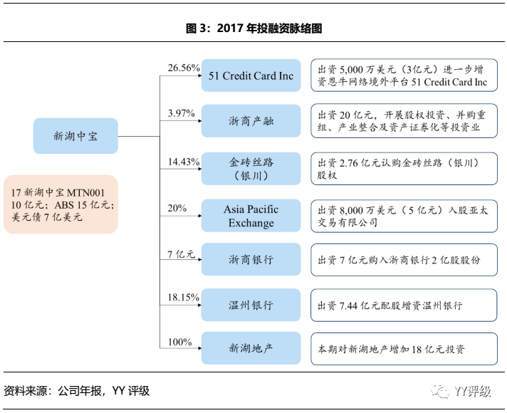 2017年,公司融資端有息債務(wù)規(guī)模減少2億元,其中當(dāng)年新發(fā)行17新湖中寶MTN00110億元和ABS 15億元。帶來的資產(chǎn)端變化包括(1)長期股權(quán)投資增加20億元,其中包括對子公司新湖地產(chǎn)的增資18億元,以及出資7.44億元配股增資溫州銀行;(2)可供出售金融資產(chǎn)增加14億元,但由于公司本期還發(fā)行了7億美元(人民幣45億元)的境外債,未包含在母公司個別報表中,因此,從合并報表視角看當(dāng)年公司的可供出售金融資產(chǎn)會更加全面。