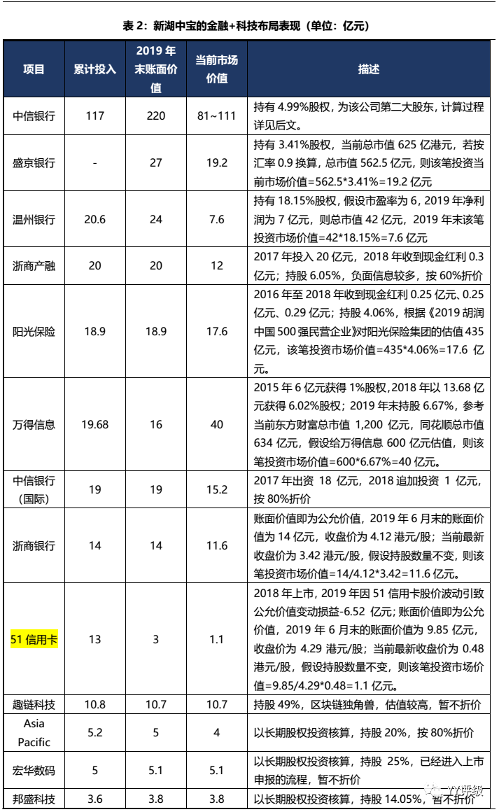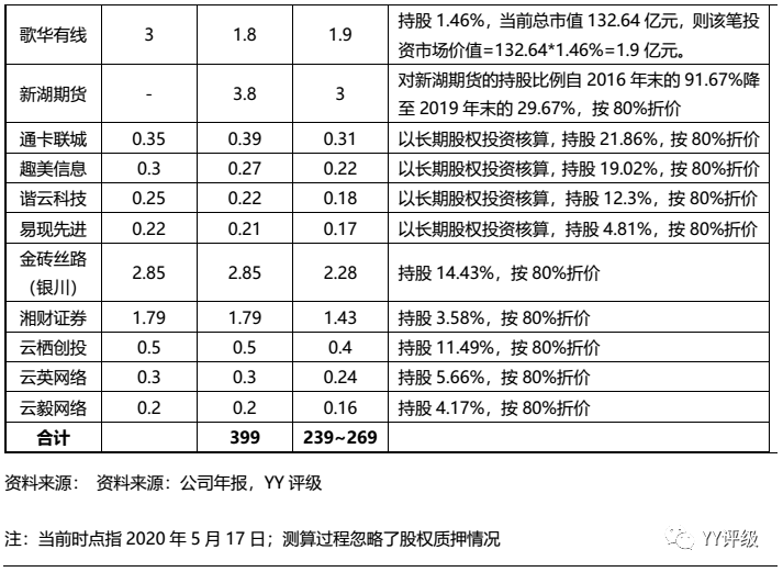 根據(jù)新湖中寶2019年年報披露,新湖中寶持有中信銀行H股24.46億股,根據(jù)當(dāng)前股價3.67港元、匯率0.9計算得到該筆投資的市場價值為81億元;若按照持股比例4.99%,總市值2,232億元計算得到該筆投資的市場價值為111億元。兩次計算結(jié)果差別較大主要是由A股和H股存在價格差異導(dǎo)致。