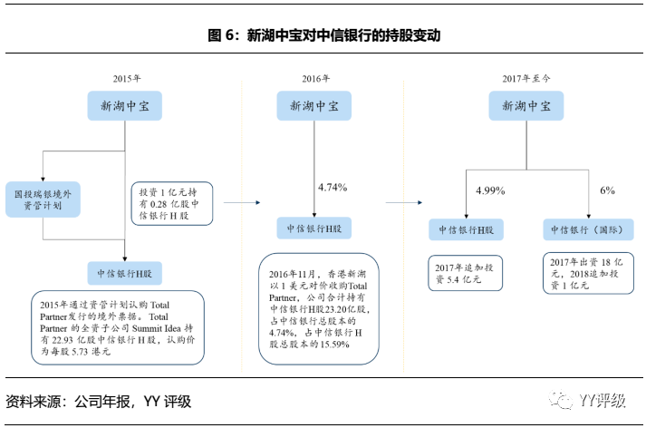 隨后在2016年11月,香港新湖以1美元對價收購TotalPartner,實(shí)現(xiàn)對中信銀行H股的持有,共計23.20億股,占中信銀行總股本的4.74%,占中信銀行H股總股本的15.59%,并派遣董事進(jìn)入中信銀行董事會。由此,新湖中寶將該投資從可供出售金融資產(chǎn)轉(zhuǎn)出至長期股權(quán)投資進(jìn)行核算。2017年新湖中寶又對該部分投資追加5.4億元,累計總投資117億元(22.93*5.73*0.84+1+5.4)。