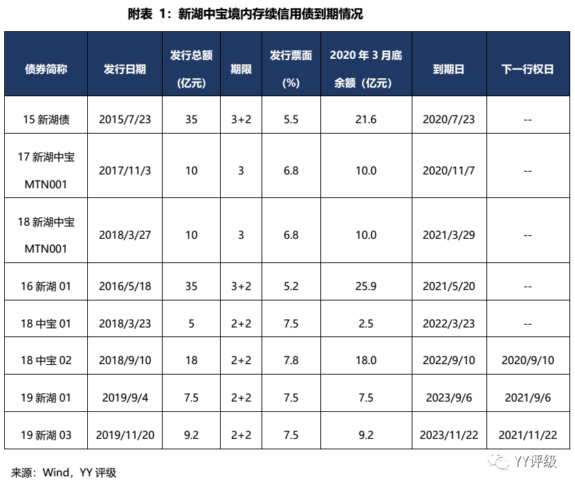 截至2020年3月末,不考慮行權(quán)情況下,新湖中寶一年內(nèi)境內(nèi)信用債到期壓力為41.6億元,ABS到期額11.35億元,無境外美元債到期,合計52.95億元;進(jìn)一步考慮行權(quán),假設(shè)全部行權(quán),則再增加境內(nèi)信用債18億元和美元債5.15億美元,合計107億元。考慮市場信心不足,可能選擇行權(quán)的機(jī)構(gòu)較多,壓力測試應(yīng)按107億來核算。