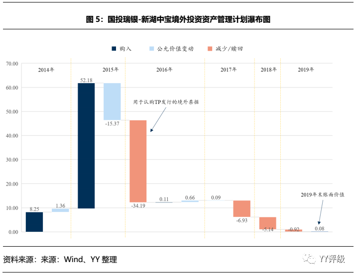 新湖中寶的金融+科技布局中,對中信銀行的投資額最大,當(dāng)前市場價值最高。公司于2015年投向國投瑞銀境外資管計劃62億,其中52億元投向了國投瑞銀-新湖中寶境外投資資產(chǎn)管理計劃(下稱“資管計劃”)。根據(jù)公司公告,資管計劃主要用于認(rèn)購BVI公司Total Partner Global Limited(以下簡稱“Total Partner”)發(fā)行的境外票據(jù)。Total Partner的全資BVI子公司Summit Idea Limited(以下簡稱“Summit Idea”),以國投瑞銀對境外票據(jù)的認(rèn)購金額配合相關(guān)銀行貸款,認(rèn)購UBSLondon持有的22.93億股中信銀行H股股份,認(rèn)購價為每股5.73港元,認(rèn)購后股份由Summit Idea持有。根據(jù)公司年報,我們繪制了資管計劃賬面價格變動瀑布圖(見圖5),推測該資管計劃對境外票據(jù)的認(rèn)購金額為34億元。另外10億元則是投向了國投瑞銀新湖中寶境外資產(chǎn)配置1號資產(chǎn)管理計劃,該筆投資在當(dāng)年賺了100萬之后就進(jìn)行了贖回,2016年又投了2.7億元,大部分在之后三年進(jìn)行了贖回,虧損部分金額不大,2019年末賬面余額2萬元,基本清零。