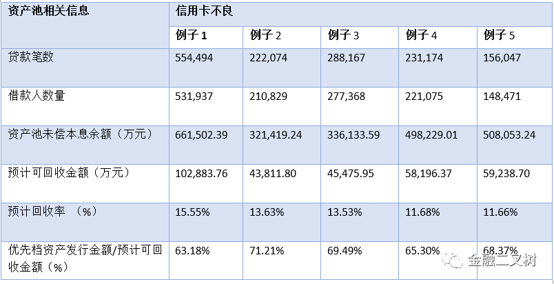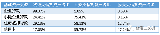 不良ABS根據(jù)基礎(chǔ)資產(chǎn)不同可以分為信用卡類、企業(yè)貸款類、小微企業(yè)貸款類、住房抵押貸款類、個(gè)人汽車貸款類、一般消費(fèi)貸款類和混合貸款類。在這幾種資產(chǎn)中信用卡類是被認(rèn)為分散度最高的,這是由于信用卡類客戶以及貸款性質(zhì)決定的,這類ABS入池貸款筆數(shù)相較其他類ABS是最多的,每筆規(guī)模也普遍較小,以下表為例: