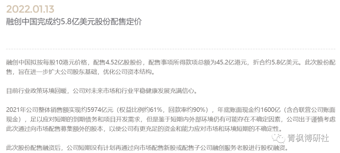 2022年1月13日,融創(chuàng)中國發(fā)布公告稱,其以10港元/股的對價(jià)配售4.52億股股份,配售所得款項(xiàng)總額為45.20億港元(折合美元約5.80億)。不過這次配股的價(jià)格相較于2021年11月13日的15.18港元/股折價(jià)幅度達(dá)34.12%,相較于2022年1月11日的收市價(jià)折價(jià)幅度則達(dá)到15%。據(jù)融創(chuàng)自身披露,其擬將配售所得款項(xiàng)的50%用于公司一般運(yùn)營,另50%用于償還貸款。