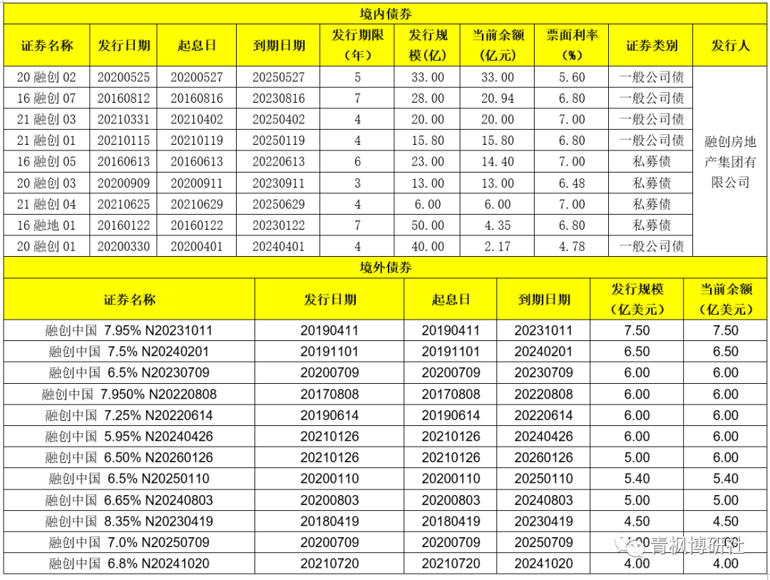 (一)目前融創(chuàng)合計(jì)共有9只境內(nèi)存量債券,余額合計(jì)達(dá)到129.66億元人民幣。其中,2022年到期23億元,2022年需要付息約14億元人民幣。