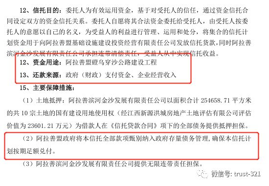 項(xiàng)目本身是一個(gè)常見的基建類信托,資金用于公路建設(shè),彼時(shí)對(duì)政府三件套之類尚未嚴(yán)厲約束,風(fēng)控中有一個(gè)“將信托全部款項(xiàng)納入政府存量債務(wù)管理”的措施(背后應(yīng)當(dāng)有紅頭文件支持),也就是明確了該筆借款屬于“政府債務(wù)”。
