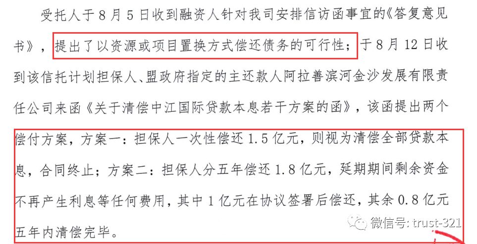 大家來“品一品”這個(gè)借款人多么強(qiáng)硬:先是要求以資源或項(xiàng)目置換(好奇用什么置換,難道是阿拉善的梭梭樹嗎……),估計(jì)遭到管理人拒絕后提出兩個(gè)方案:
