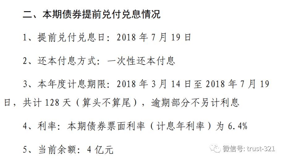 其次是債券提前償還。銀象350盡調(diào)資料中提到,融資人2013年4月發(fā)行了10億公司債券,該債券期限7年,本應(yīng)晚于信托到期日;但該債券在2018年7月提前兌付且在7月19日摘牌,導(dǎo)致實(shí)際上的償還日早于信托到期日。