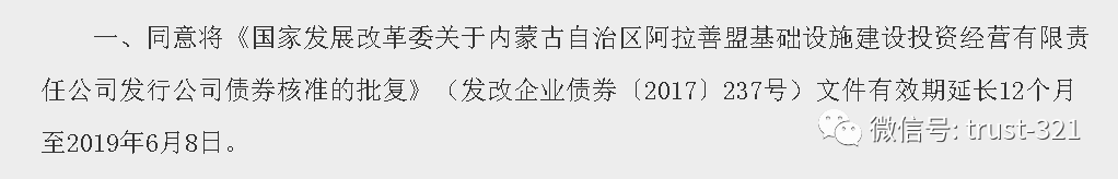 最后也是最關(guān)鍵的,連續(xù)發(fā)債失敗:2017年6月,國(guó)家發(fā)改委曾核準(zhǔn)阿拉善盟基礎(chǔ)建設(shè)投資經(jīng)營(yíng)有限公司(項(xiàng)目融資方)發(fā)行17億公司債券:但由于種種原因,這個(gè)債券發(fā)行失敗了;2018年6月,該公司向發(fā)改委申請(qǐng)批復(fù)有效期延長(zhǎng)一年,至2019年6月,并獲得發(fā)改委許可: