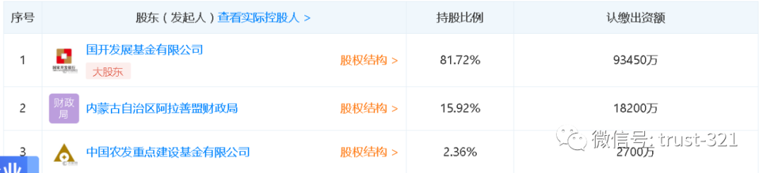 一次是2017年12月,股東由阿拉善盟財(cái)政局100%持股,變成了目前的三家持股,國(guó)開發(fā)展基金有限公司出資9.34億,成為第一大股東: