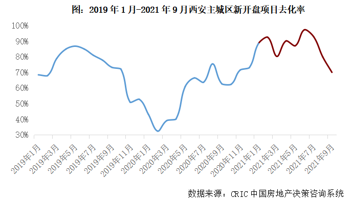微觀層面,項目銷售表現仍然亮眼,去化率升至近三年來高位。前9月,西安主城區新開盤項目平均去化率高達88%,較2020、2019年同期分別增長31個百分點和6個百分點,2、6、7月等月份去化率皆在95%左右,意味著當月新入市項目基本都實現開盤即罄。