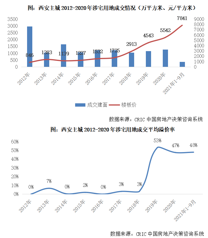 2019年,西安地市全面火爆,房企逢拍必搶,全年涉宅用地平均溢價率高達53%,一改往年宅地底價成交為主的局面,平均樓板價躍升至4543元/平方米。更具里程碑意義的是,西安宅地價格首次邁過“萬元”門檻,城東1宗以及高新4宗地塊成交樓板價每平方米“破萬”,新晉地王高新區GX3-35-7地塊樓面價高達11182元/平方米。