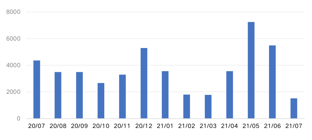 圖:2017-2021年7月房企境內發債規模(億元)