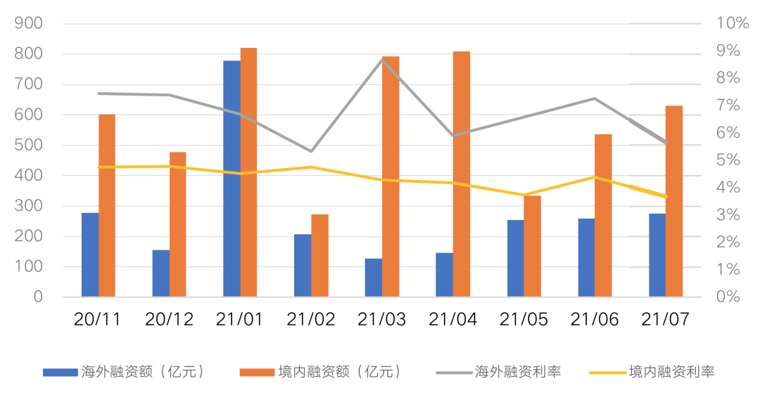 圖:近9個月房企境內及海外債總額(億元)&融資利率