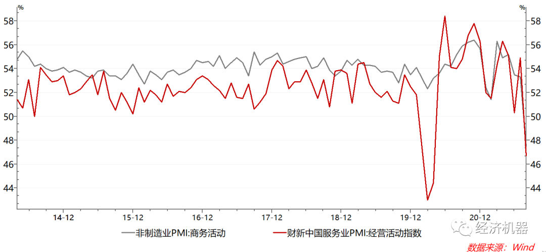 2)官方和財新的服務(wù)業(yè)PMI均出現(xiàn)了更大幅的回落,均已跌至50以下(圖2),反映了7月份以來疫情二次暴發(fā)的沖擊和影響遠(yuǎn)大于預(yù)期;