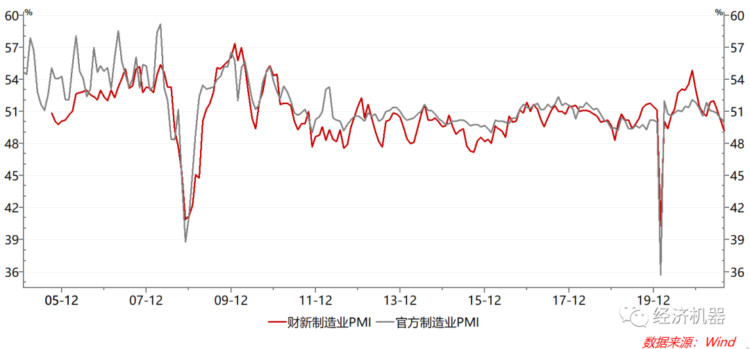 1)官方制造業(yè)PMI連續(xù)5個月回落,財新PMI過去16個月以來,第一次跌至50榮枯線以下(圖1)。