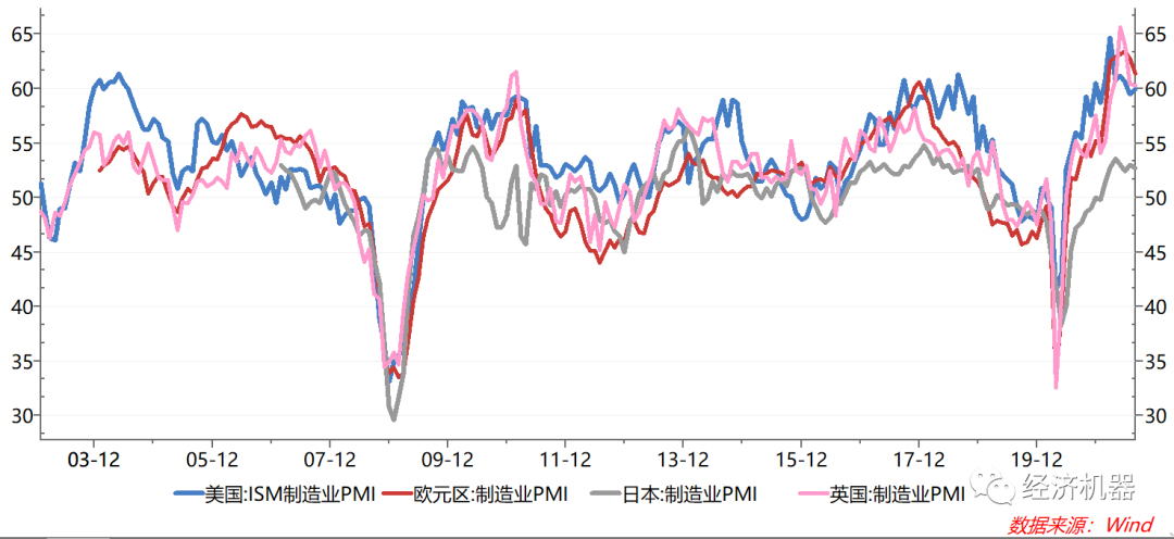 從需求角度看,海外需求的高點或已出現(xiàn)。海外主要經(jīng)濟(jì)體的制造業(yè)PMI指數(shù)近幾個月均出現(xiàn)了高點回落(圖6),這意味著未來幾個月,其進(jìn)口增速也將逐漸回落。隨著疫苗注射的推進(jìn),供應(yīng)鏈的恢復(fù),我國出口增速很可能在明年初迎來拐點。