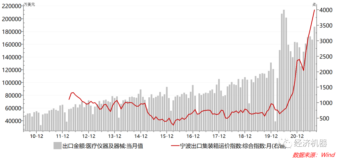 疫情再次惡化,沖擊全球供應(yīng)鏈,推動我國出口保持強(qiáng)勁。6月份以來,在歐洲杯、奧運會等大型聚會成了“病毒狂歡節(jié)”,推動疫情再次反彈,全球供應(yīng)鏈再次受到擾動。寧波海運價格指數(shù)再創(chuàng)新高,同時8月份醫(yī)療器械出口再次加速(圖5),這些都推動著出口保持高速增長。