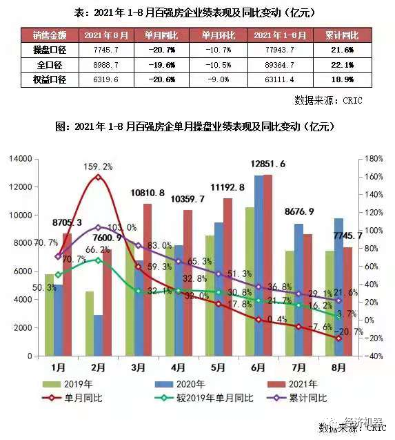 而需求“入冬”,或是壓垮地產(chǎn)商的“最后一根稻草”。8月份,百強(qiáng)企業(yè)單月操盤銷售金額下降20.7%,單月環(huán)比下降10.7%。剔除去年基數(shù)效應(yīng),和2019年比,增速也在快速回落(下圖、表)。在融資條件收緊情況下,銷售回款成為"去杠桿”和改善財務(wù)狀況的唯一途徑。如果需求快速惡化,則會有一大批民營開發(fā)商排隊倒下,清理出局。