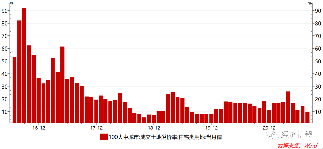 資金鏈緊張情況,已經(jīng)影響到企業(yè)拿地,部分頭部民營企業(yè)今年拿地金額出現(xiàn)斷崖式下降,恒大、碧桂園、世貿(mào)、金科、中南置地、佳兆業(yè)、陽光城等民營地產(chǎn)商顯著放緩了拿地的步伐(圖8),土地拍賣溢價率不斷創(chuàng)新低,流拍率不斷上升(圖9)。