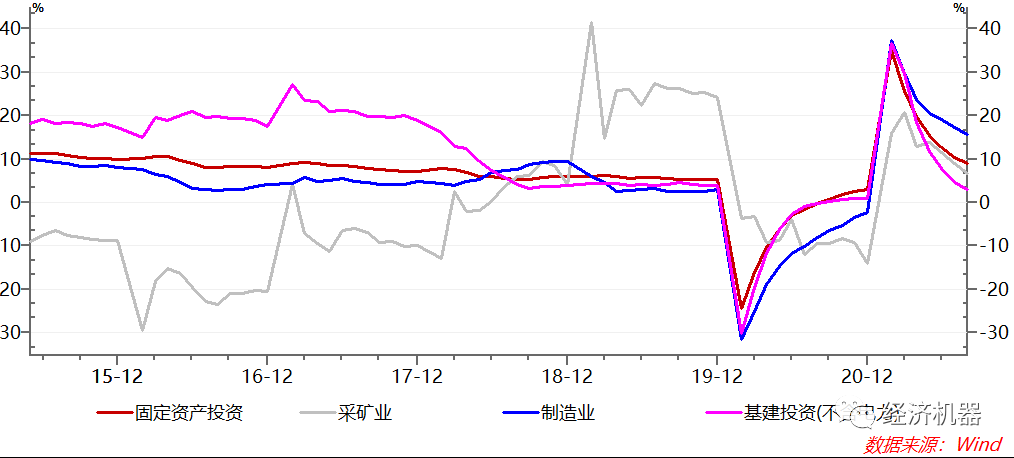 固定資產(chǎn)增速8月份也出現(xiàn)了進(jìn)一步下滑。8月份累計同比增速進(jìn)一步放緩至8.9%(圖11)。其中制造業(yè)投資增速放緩至15.7%。而處于高景氣狀態(tài)的采礦業(yè),投資增速僅為6.7%,顯示大宗商品暴漲并未激發(fā)信心和投資需求。這一方面是由于在雙碳戰(zhàn)略、環(huán)保和去產(chǎn)能三條高壓線下,供給剛性現(xiàn)象突出;另一方面,企業(yè)普遍對當(dāng)前的高景氣狀態(tài)持續(xù)性存疑,信心普遍不足。寧可拿高利潤償還債務(wù),也不會增加資本支出。