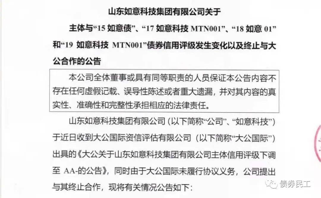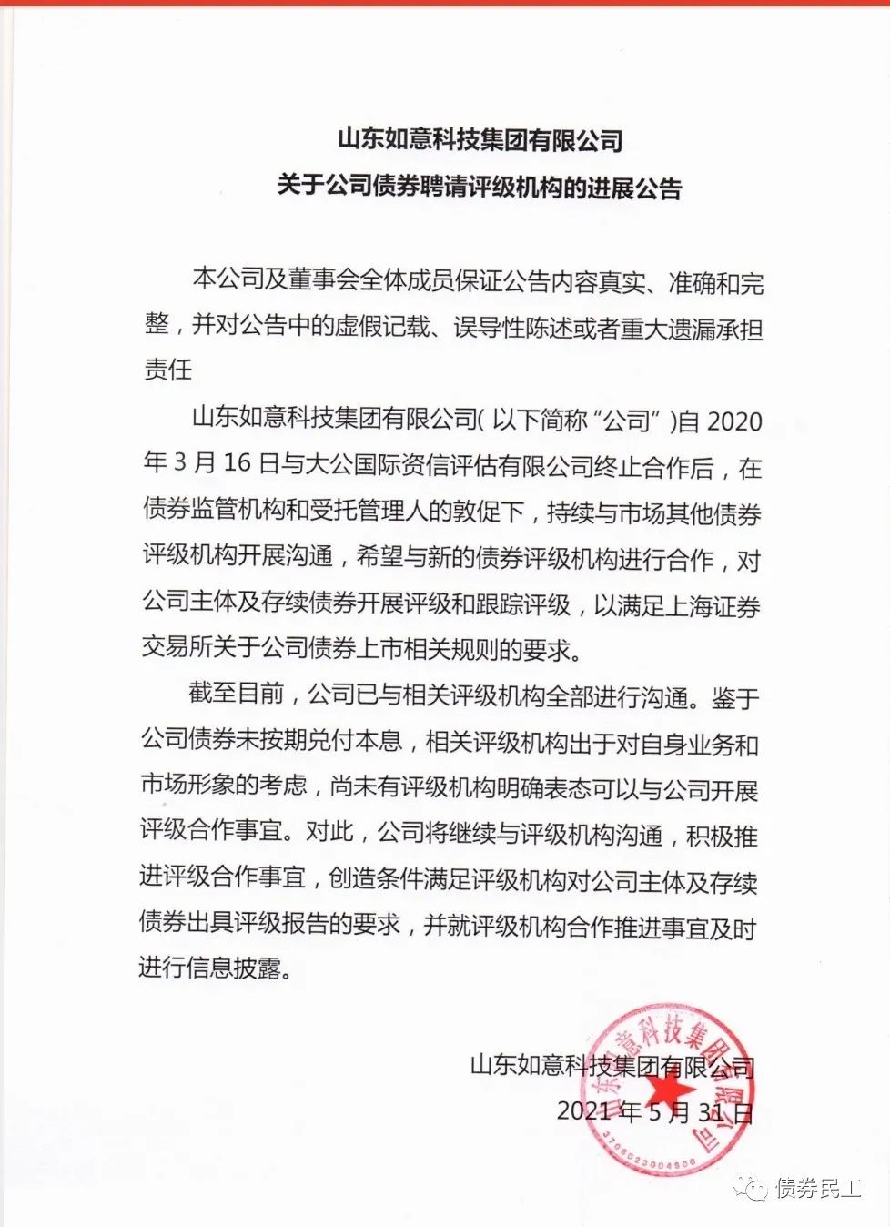 根據(jù)山東如意科技集團(tuán)有限公司(以下簡(jiǎn)稱“如意集團(tuán)”)2021年5月31日的公告,自公司2020年3月16日終止與大公國(guó)際的評(píng)級(jí)合作之后,公司與評(píng)級(jí)機(jī)構(gòu)全部溝通完畢,沒有評(píng)級(jí)公司與公司開展評(píng)級(jí)合作。這在信用債券市場(chǎng)上也是很少見的了,畢竟多數(shù)債券都需要披露跟蹤評(píng)級(jí)報(bào)告。