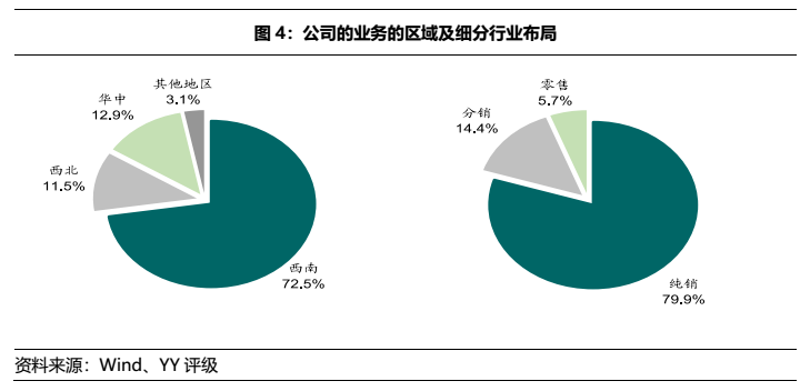 重慶醫(yī)藥是重慶最大的醫(yī)藥流通企業(yè),深耕西南地區(qū),業(yè)務(wù)以純銷(xiāo)(約80%)、藥品銷(xiāo)售(90%+)為主。