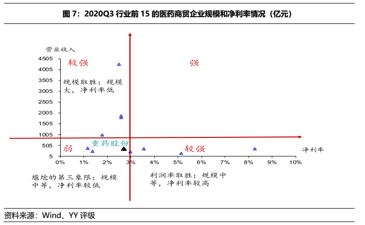 重慶醫(yī)藥處于進(jìn)退兩難的尷尬處境。公司的規(guī)模沒(méi)有4家全國(guó)性藥企大,利潤(rùn)率沒(méi)有華東醫(yī)藥等區(qū)域性藥企高,處于尷尬的第三象限。此時(shí),選擇擴(kuò)張?則利潤(rùn)率可能會(huì)進(jìn)一步下滑,盈利能力可能進(jìn)一步惡化,原來(lái)就不富裕的現(xiàn)金流雪上加霜;不擴(kuò)張?則面臨4大龍頭侵蝕市場(chǎng)份額,也無(wú)法突圍,就像掉進(jìn)了中產(chǎn)階級(jí)陷阱,騎虎難下,較難突圍。