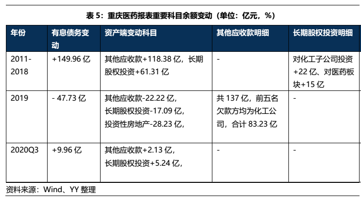 集團(tuán)層面來(lái)看,其財(cái)務(wù)弊病是母公司和重慶醫(yī)藥二者的集合。由于近幾年在著重培育醫(yī)藥板塊、縮減化工板塊,集團(tuán)新增的負(fù)債和資產(chǎn)基本都集中于此,導(dǎo)致集團(tuán)新增債務(wù)的問(wèn)題基本源于重慶醫(yī)藥,此外母公司的遺留問(wèn)題也是成為一大包袱。