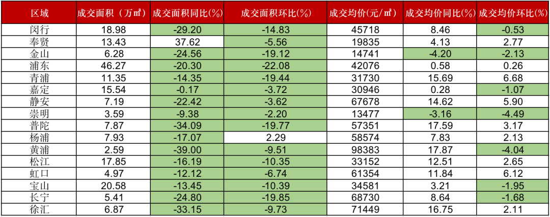 具體到區(qū)域來(lái)看,閔行、金山、浦東、靜安、普陀、長(zhǎng)寧同環(huán)比跌幅較大,而奉賢為上海唯一成交面積同比增長(zhǎng)的區(qū)域。成交均價(jià)方面,金山、崇明出現(xiàn)同、環(huán)比下跌,閔行、嘉定、黃浦、寶山、長(zhǎng)寧同比上漲,環(huán)比下跌。