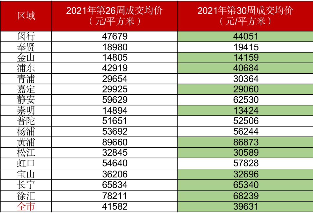 結(jié)果顯示,全市來(lái)看,2021年26周上海全市商品房成交價(jià)為41582元/平方米,隨著二手房“核定價(jià)”的發(fā)布,2021年30周上海全市商品房成交價(jià)降至39631元/平方米,一個(gè)月不到的時(shí)間就已跌去約2000元/平方米。