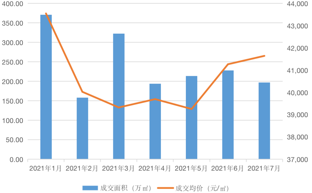 從成交數(shù)據(jù)來(lái)看,2021年7月,上海全市商品房成交面積196.7萬(wàn)平方米,同比下降17.68.環(huán)比下降13.7%,成交均價(jià)41644元/平方米,同比上漲3.72%,環(huán)比微增0.91%。